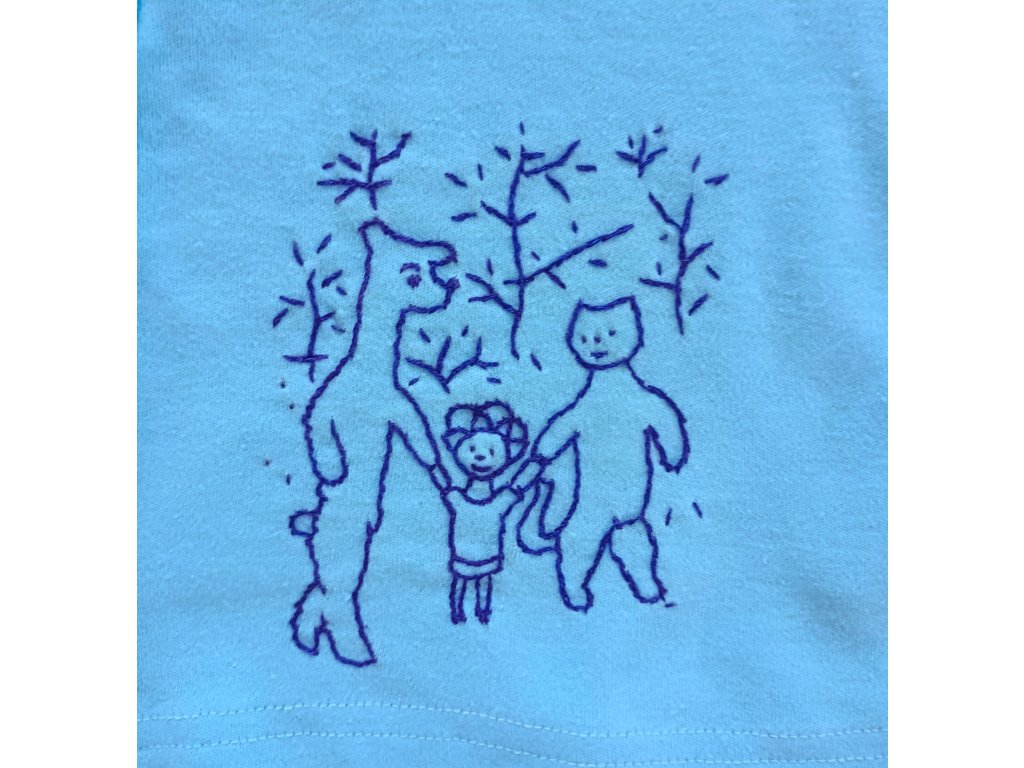 Košilka je modrá s vyšívaným motivem z Čapkovy knihy Povídání o pejskovi a kočičce, použila jsem tmavě modrou moulinku DMC.