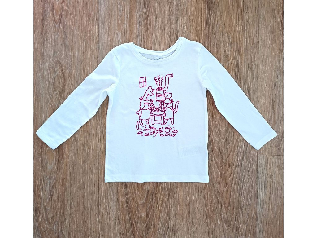 Ručně vyšívané bílé bavlněné dětské tričko velikosti 110/116 s dlouhými rukávy a motivem pejska a kočičky z knížky Josefa Čapka Povídání o pejskovi a kočičce - Jak vařili dort.