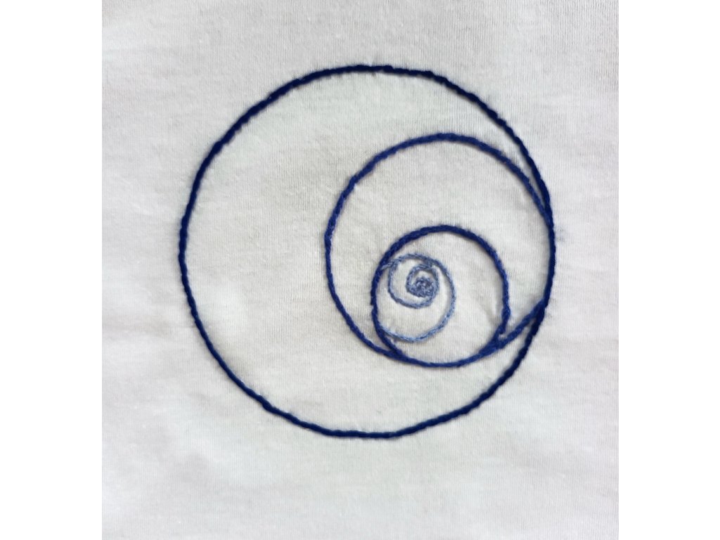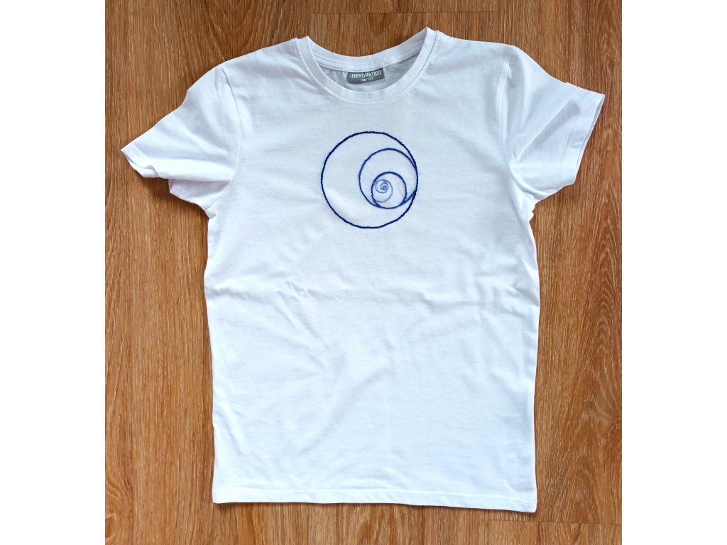 Ručně vyšívané bílé bavlněné dětské tričko s krátkým rukávem velikosti 146/152 s Fibonacciho posloupností.